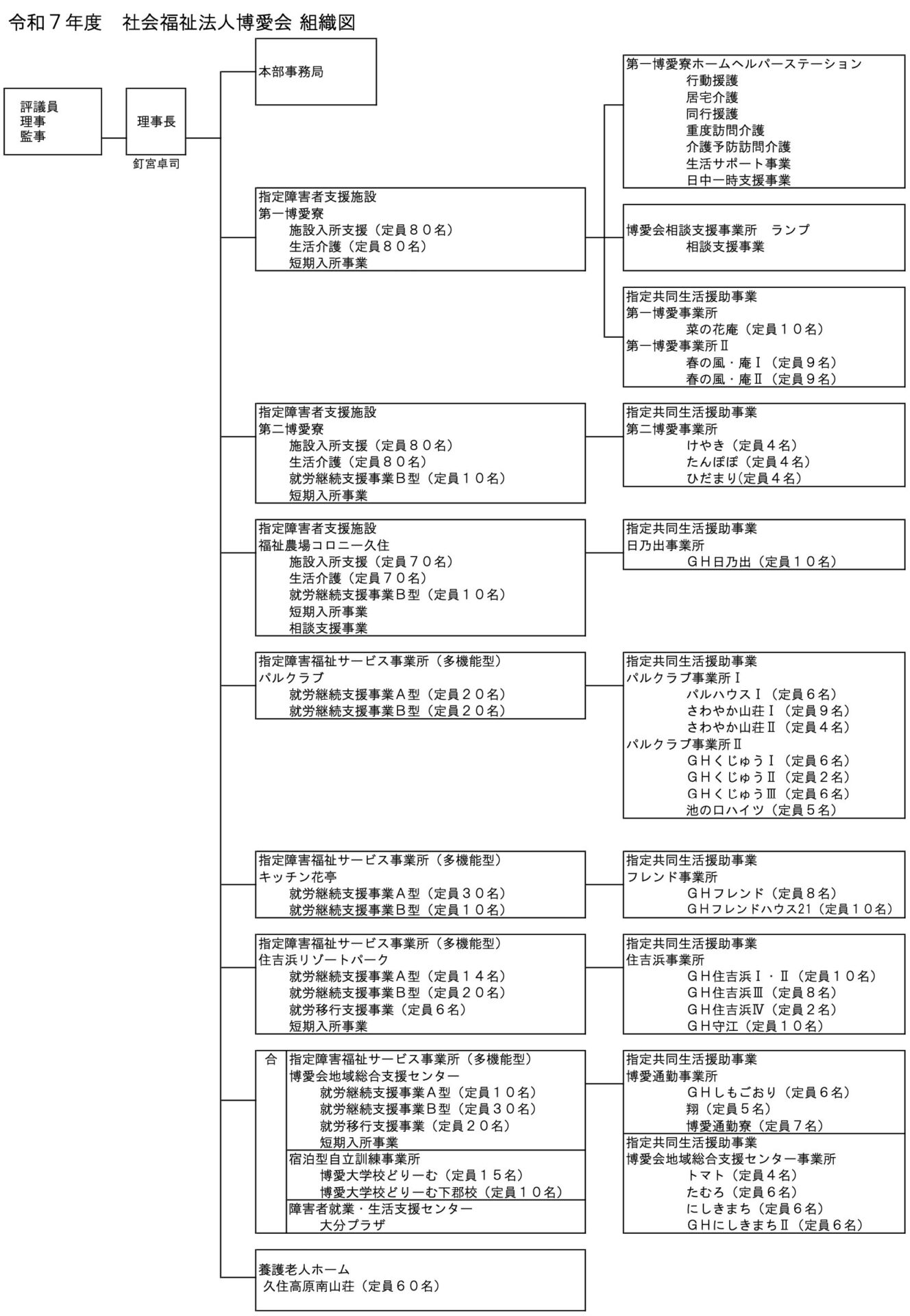 組織・概要博愛会トップ法人概要組織・概要法人概要法人名社会福祉法人 博愛会代表者理事長 釘宮卓司法人本部所在地大分市大字野田759番地1TEL097-586-6121FAX097-586-6115メールアドレスhakuai.team@feel.ocn.ne.jp役員構成評議員 7名理事 6名監事 2名支援対象者約450名職員数約180名博愛会組織図(令和7年度)組織図ダウンロード