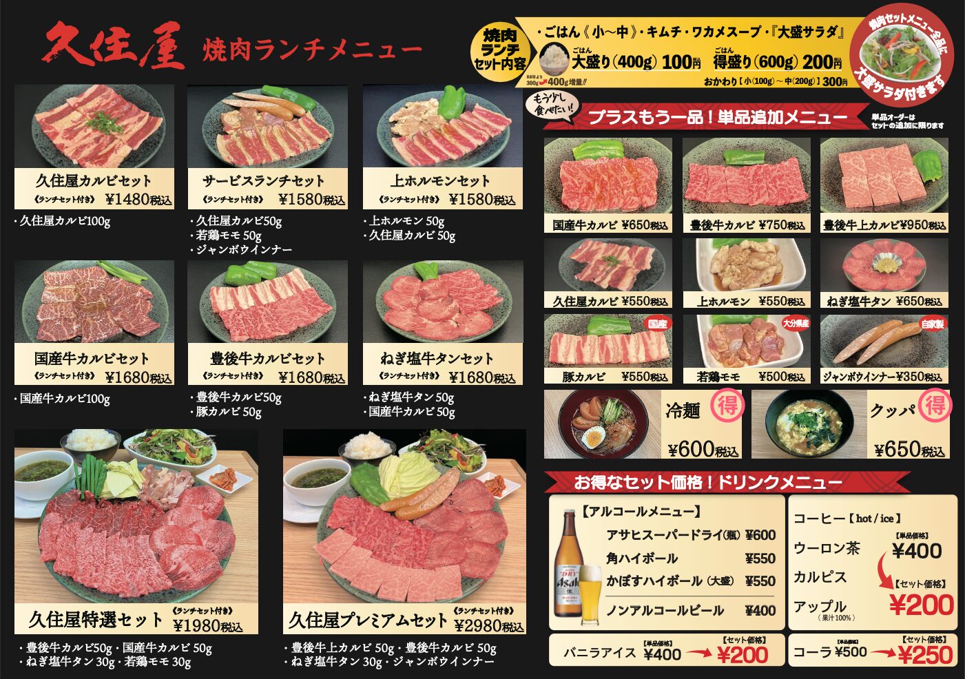 お昼に本格的な洋食を中心としたメニューと、豊後牛が自慢の本格焼肉メニューを楽しめる構成で、すべての料理に自社農場産の新鮮大盛サラダが付き、健康でボリューム満点なメニューを多数ご用意しております。